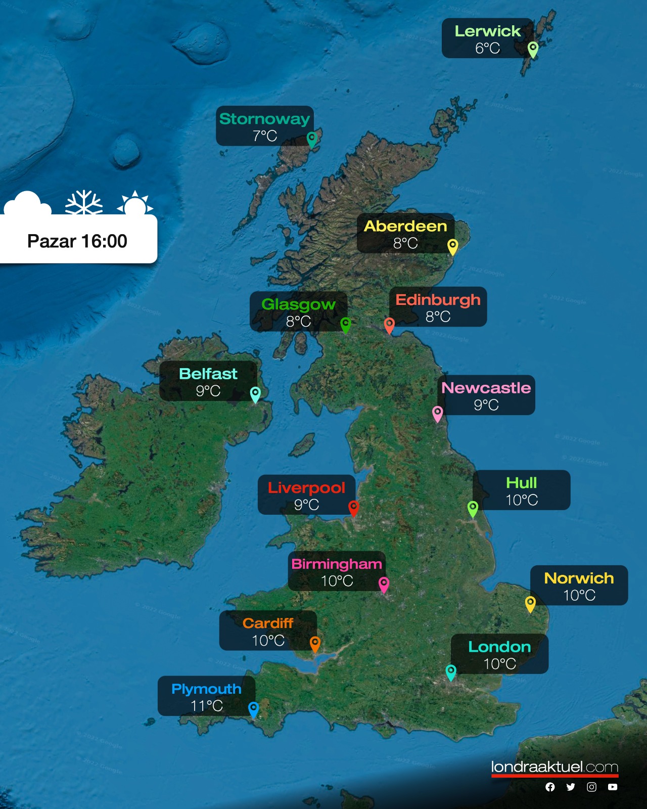 12 – 13 Şubat hafta sonunda Birleşik Krallık genelinde yağmur zaman zaman görülecek. Pazar günü yağmurun kuzeye ne kadar ilerleyeceği ise belirsizliğini koruyor. Cumartesi ve Pazar günü Birleşik Krallık genelinde ortalama hava sıcaklıklarının şu şekilde olması bekleniyor
